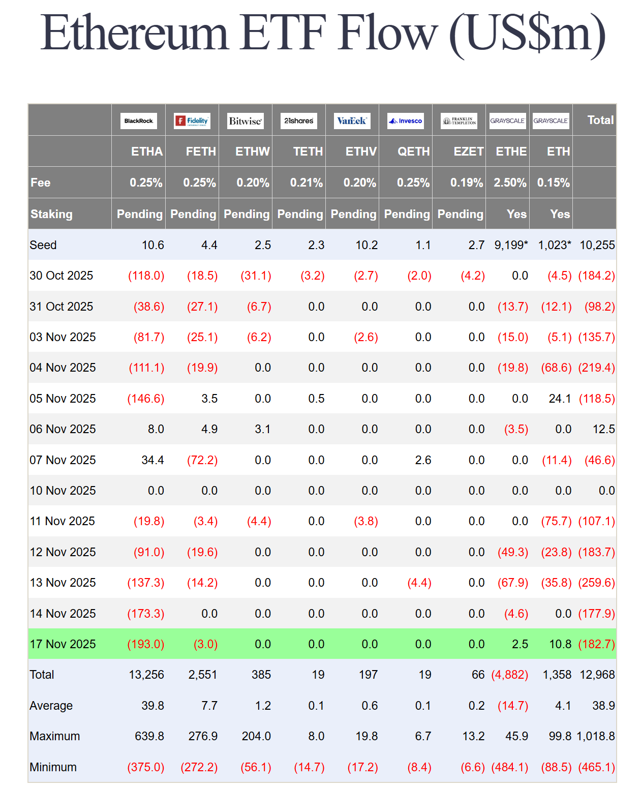 Farside Investors verilerine göre Spot Ether (ETH) ETF’leri Pazartesi günü de yoğun çıkışlar yaşamaya devam ederek toplam 182,7 milyon dolarlık çıkış kaydetti. En büyük düşüş, tek seansta 193 milyon dolarlık çıkış kaydeden BlackRock’un iShares Ethereum Trust ETF’sinden (ETHA) geldi.