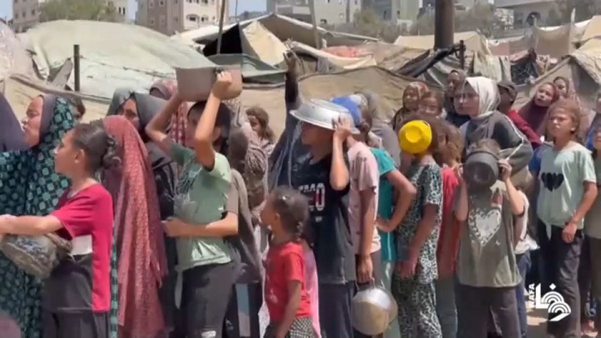Savaşın yerinden ettiği Filistinli çocuklar, Gazze'nin merkezinde yer alan Deir al-Belah kentindeki mülteci kampında zor koşullar altında hayatta kalmaya çalışıyor. Çocuklar her gün bir hayır kurumunun aşevinden yiyecek almak için sıraya giriyor.